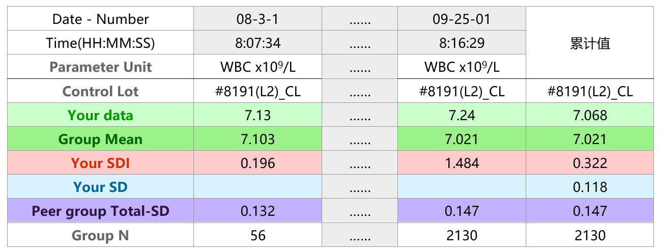 第三个不确定的分量是仪器本身的不确定度,我们采用质控品的日间变异数据来替代,记为UQC,注意:要用靶值与校正品靶值接近的质控品的数据,例如中值质控,其各个参数靶值接近校正品的靶值。为什么呢?因为我们计算时用的是值的标准差或标准误,在统计学上,只有靶值接近或相同时,标准差或标准误才可以合并在一起。如表2,可以在SNCS上获取某一批号中值质控品WBC的日间标准差数据,UQC(即Your SD)为0.118(109/L)。